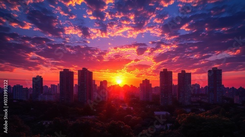 © Edo, Fototapeta premium Vibrant sunset over a city skyline with dramatic clouds.