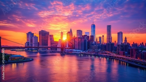 Fototapeta premium Vibrant sunset over a city skyline with reflections in the water and dynamic...