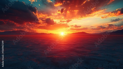 © bulegendut, Obraz premium Vibrant sunset over a cracked, dry lakebed.