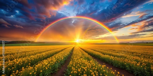 © Collection, Obraz premium Vibrant Sunset over a Field of Yellow Blossoms with a Majestic Rainbow Arc