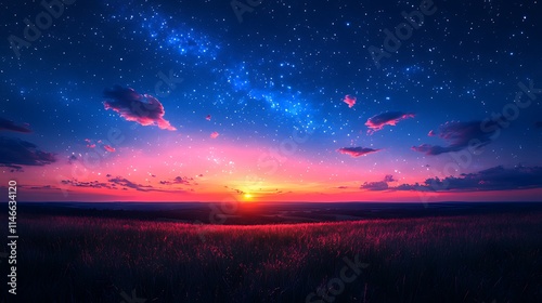 Obraz premium Vibrant sunset over a field with a stunning starry night sky.