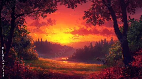 © LintanAmalliyah, Obraz premium Vibrant Sunset Over a Forest and Stream
