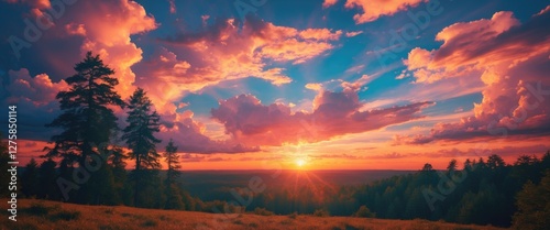 Obraz premium Vibrant Sunset Over a Forest with Dramatic Clouds and Radiant Sky Colors in a...