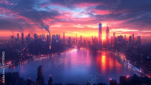© Hnf, Fototapeta premium Vibrant sunset over a futuristic city skyline reflected in calm water.