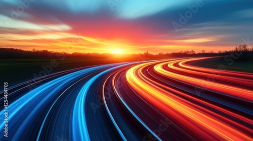 © Nursa, Naklejka premium Vibrant sunset over a highway with light trails.