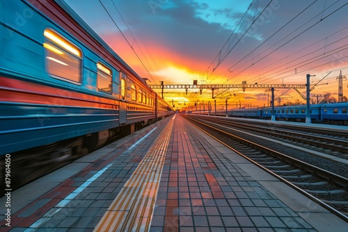 © Cris, Fototapeta premium Vibrant Sunset Over a Modern Train Station with a Moving Train