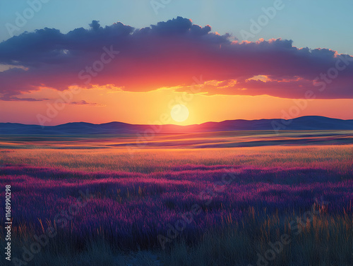 © Carmi, Obraz premium Vibrant sunset over a purple flower field and rolling hills.