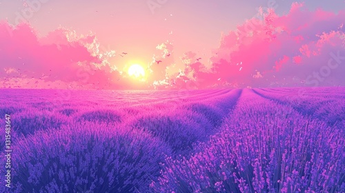 © harryaishi, Fototapeta premium Vibrant sunset over a purple lavender field.