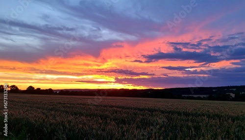© suryo, Obraz premium Vibrant Sunset Over a Rural Landscape with Dramatic Clouds.