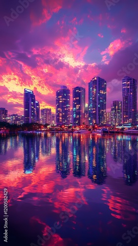 Fototapeta premium Vibrant sunset over a skyline reflecting on calm waters.