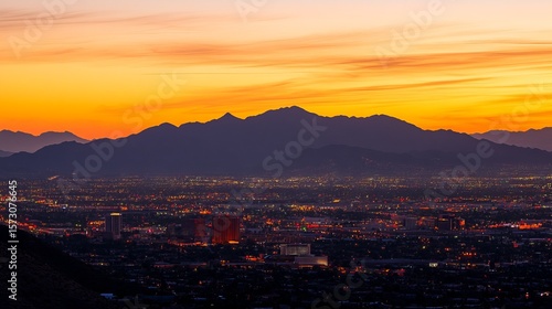 Naklejka premium Vibrant sunset over a sprawling city, silhouetted against a majestic mountain range. City lights twinkle beneath the fiery sky