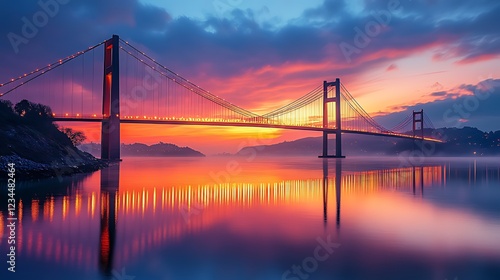 © Purnomo adi, Obraz premium Vibrant sunset over a suspension bridge reflecting on calm water.