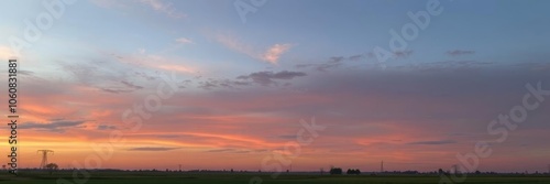 Naklejka premium Vibrant sunset over a tranquil countryside, landscape, scenic