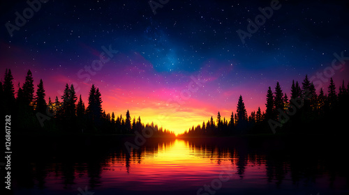 © Arthur Constantine, Fototapeta premium Vibrant Sunset Over a Tranquil Lake with Silhouetted Trees