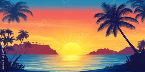 Fototapeta premium Vibrant sunset over a tropical beach with silhouetted palm trees.