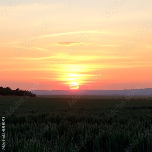 © Banci, Obraz premium Vibrant sunset over a vast, flat field.