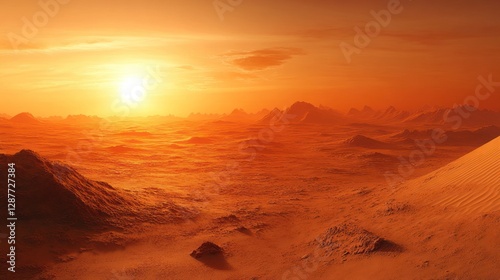 Naklejka premium Vibrant sunset over a vast, orange desert landscape with rolling sand dunes...
