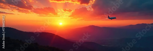 © Sathaporn Buarabut, Fototapeta premium Vibrant Sunset Over Brazilian Landscape with Ascending Airplane and Contrail