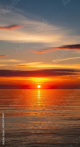 Fototapeta premium Vibrant Sunset Over Calm Ocean Waters Reflecting Golden Light.