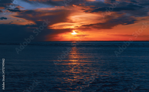 Obraz premium Vibrant sunset over calm ocean waters with colorful clouds reflecting on the surface