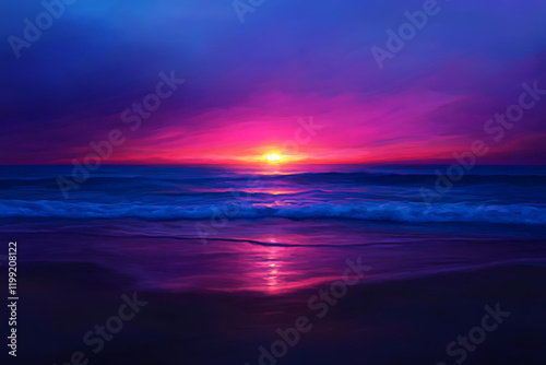 © DYAH, Fototapeta premium Vibrant sunset over calm ocean waves on a sandy beach.