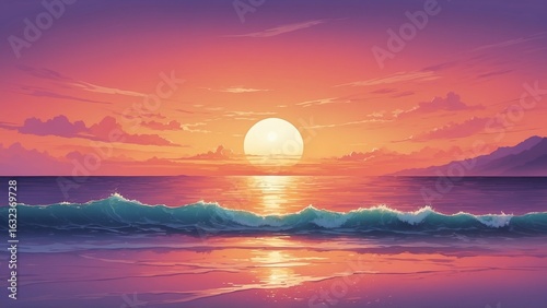 Naklejka premium Vibrant sunset over calm ocean waves on serene beach landscape