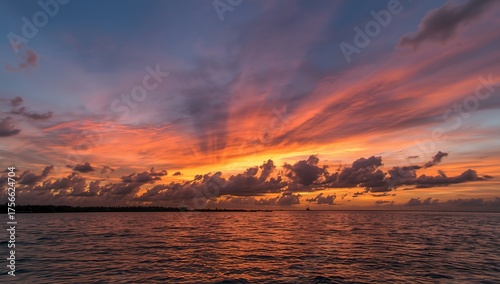 © Putra, Fototapeta premium Vibrant Sunset over Calm Ocean with Coastal Silhouette