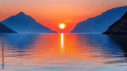 © Kusuma, Naklejka premium Vibrant sunset over calm sea between mountains.