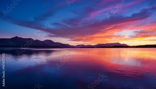 © Brycen, Fototapeta premium vibrant sunset over calm water reflecting multi colored light and distant mountains at dusk