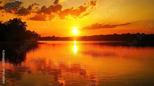 © Tuachan, Fototapeta premium Vibrant Sunset Over Calm Waters with Copper Hues