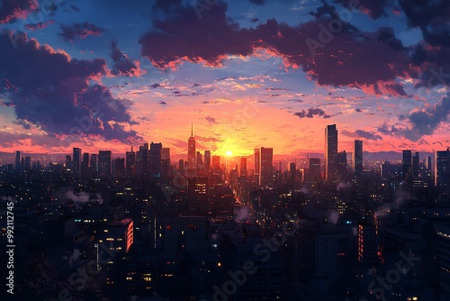 © atar, Fototapeta premium Vibrant Sunset Over City Skyline in Anime Style