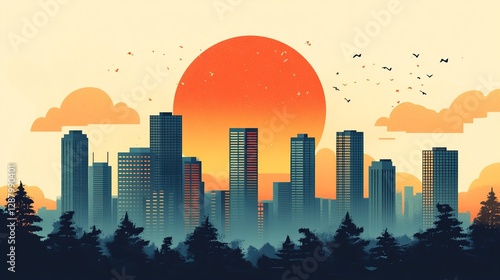 © GenerativeAIpicture, Fototapeta premium Vibrant Sunset Over City Skyline in Flat Design Vector Illustration