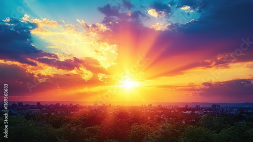 © Bejo Studio, Fototapeta premium Vibrant sunset over city skyline with sun rays through clouds