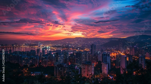 © otwdesign, Fototapeta premium Vibrant Sunset Over Cityscape Illuminating Buildings At Night