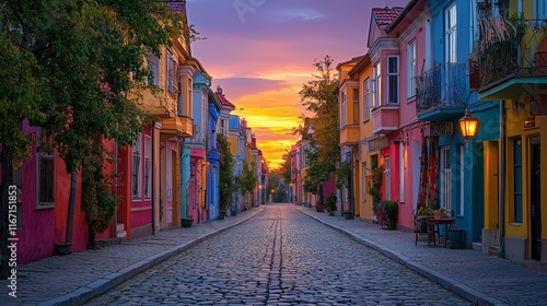 © kaiserseeing, Fototapeta premium Vibrant Sunset Over Cobblestone Street with Colorful Houses