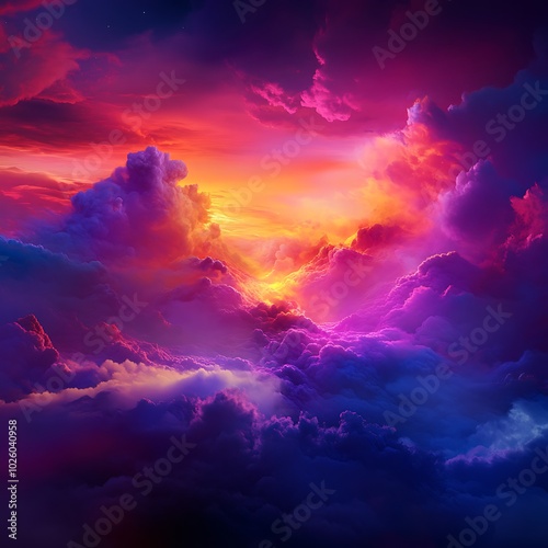 Naklejka premium Vibrant sunset over colorful clouds, dramatic sky view.