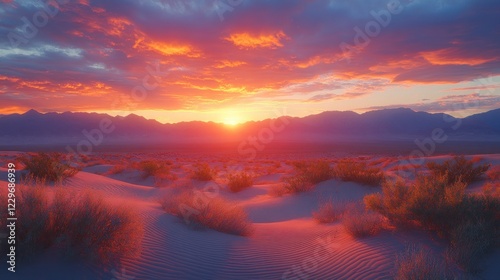 © milenialdesastudio, Obraz premium Vibrant sunset over desert landscape with sand dunes and mountains.
