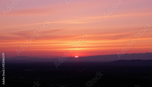 © Raitalinn, Naklejka premium Vibrant sunset over distant mountains and a hazy valley Orange and pink hues dominate the sky