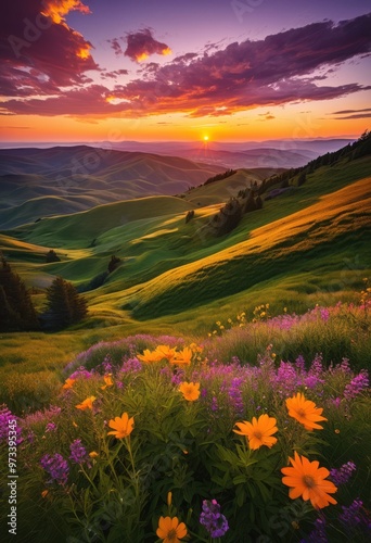 Fototapeta premium vibrant sunset over expansive green vistas showcasing rich colors lush...