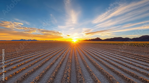 Naklejka premium vibrant sunset over field of crops, showcasing beautiful colors and patterns