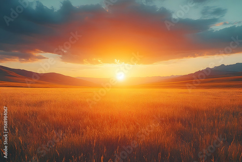 © Carmi, Fototapeta premium Vibrant sunset over golden wheat field and rolling hills.