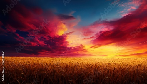 © Sorat, Obraz premium Vibrant sunset over golden wheat field with dramatic clouds.