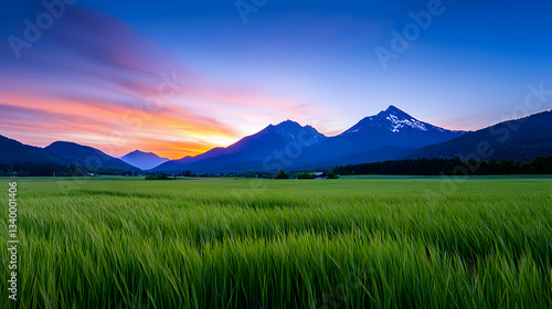 © PPS, Naklejka premium Vibrant Sunset Over Green Field and Majestic Mountains