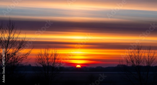 Obraz premium Vibrant sunset over horizon with silhouetted trees and colorful sky