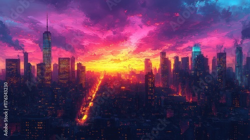 © Ali, Fototapeta premium Vibrant sunset over illuminated city skyline.