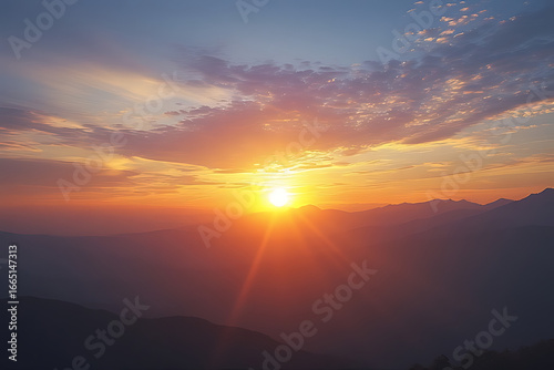 © Israt, Fototapeta premium Vibrant sunset over layered mountain ranges with dramatic sky