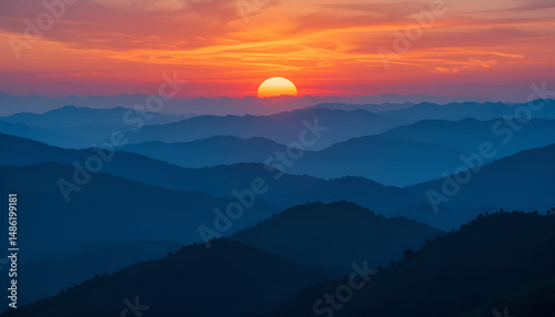 Fototapeta premium Vibrant Sunset Over Layered Mountain Ridges