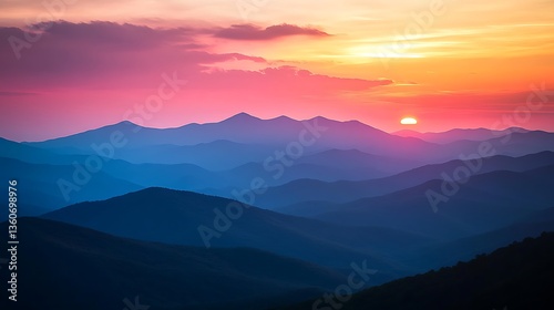 Fototapeta premium Vibrant sunset over layered mountain silhouettes.