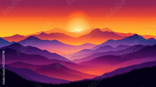 © heru, Obraz premium Vibrant sunset over layered purple, orange mountains