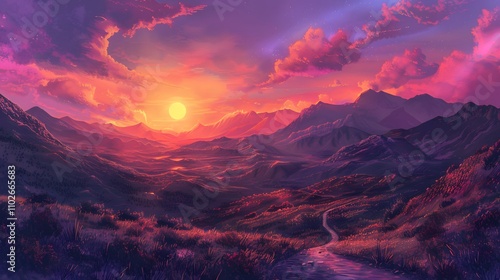 © irawan, Fototapeta premium Vibrant Sunset Over Majestic Mountain Range Landscape